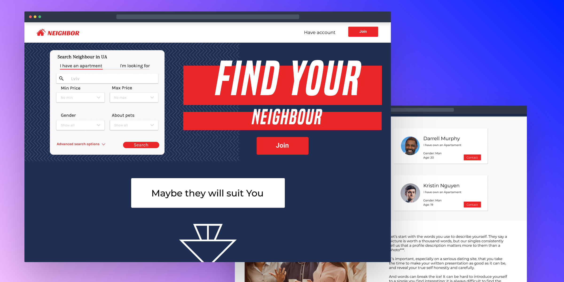 FindNeighbour is a convenient app designed to help you find the perfect roommate to share an apartment with. Whether you're looking for someone with similar interests or just a compatible living arrangement, FindNeighbour makes the process easy by connecting you with potential neighbors based on your preferences. It simplifies the search, allowing you to quickly find a trustworthy roommate and share your living space with confidence.